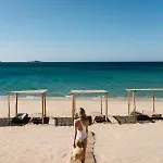 El hotel tiene una zona de playa dorada con sillones, quitasoles y toallas de playa.